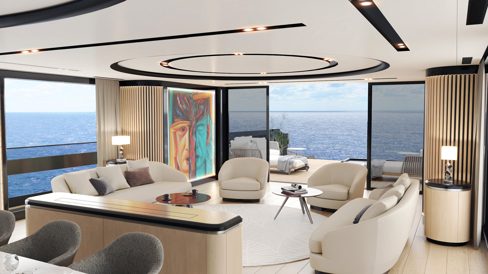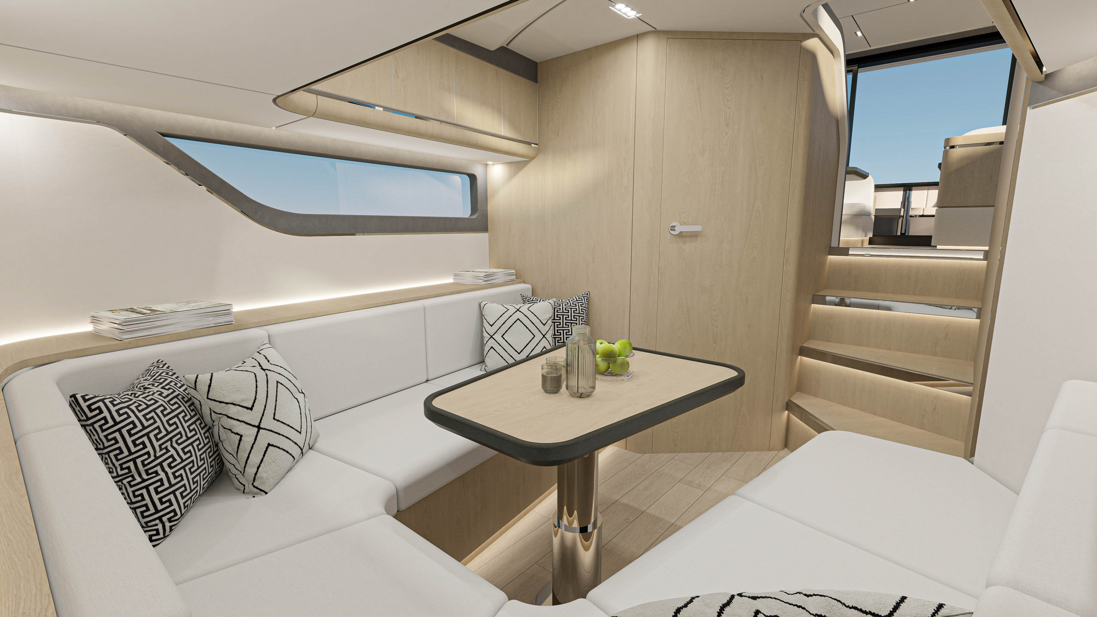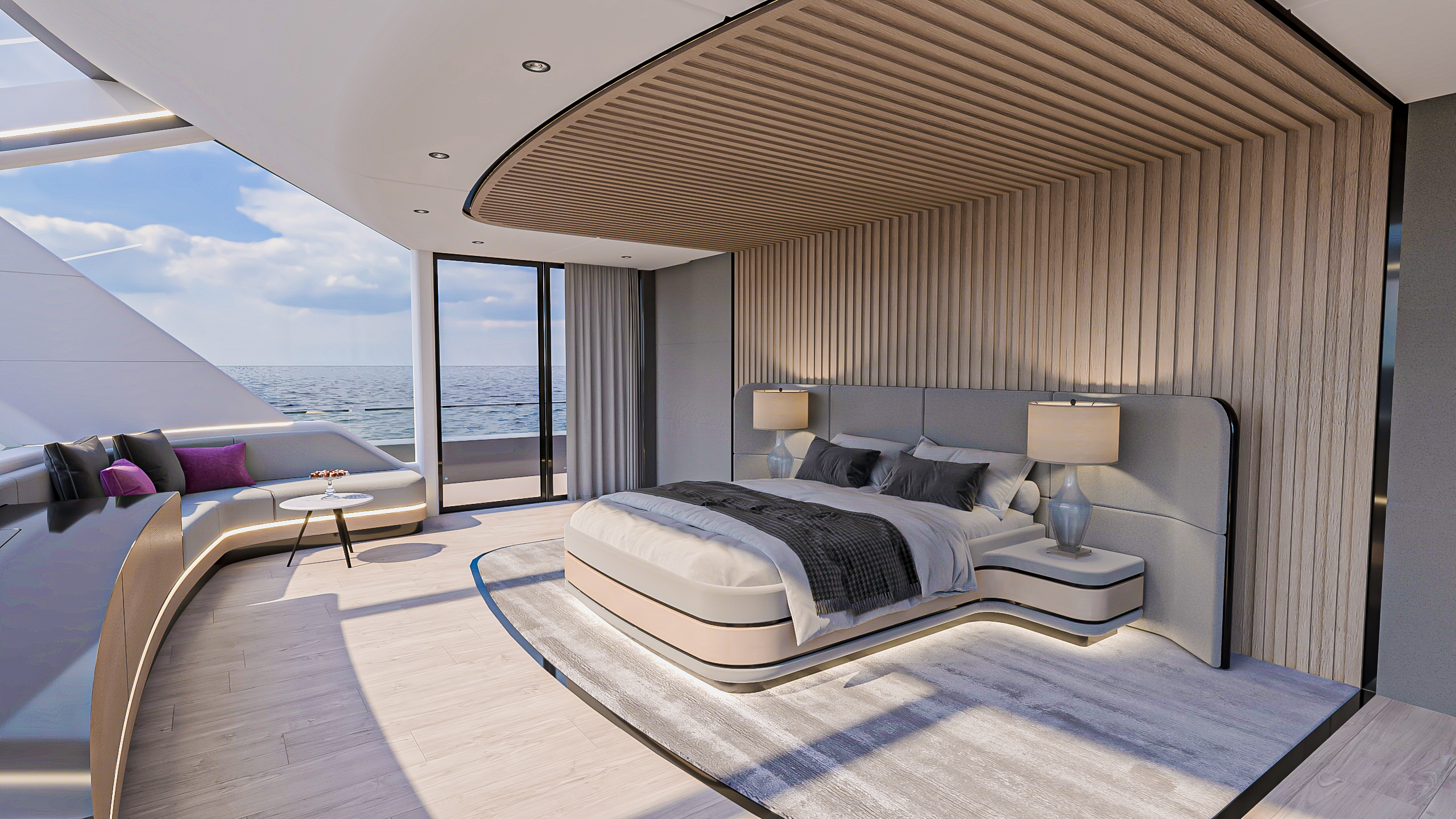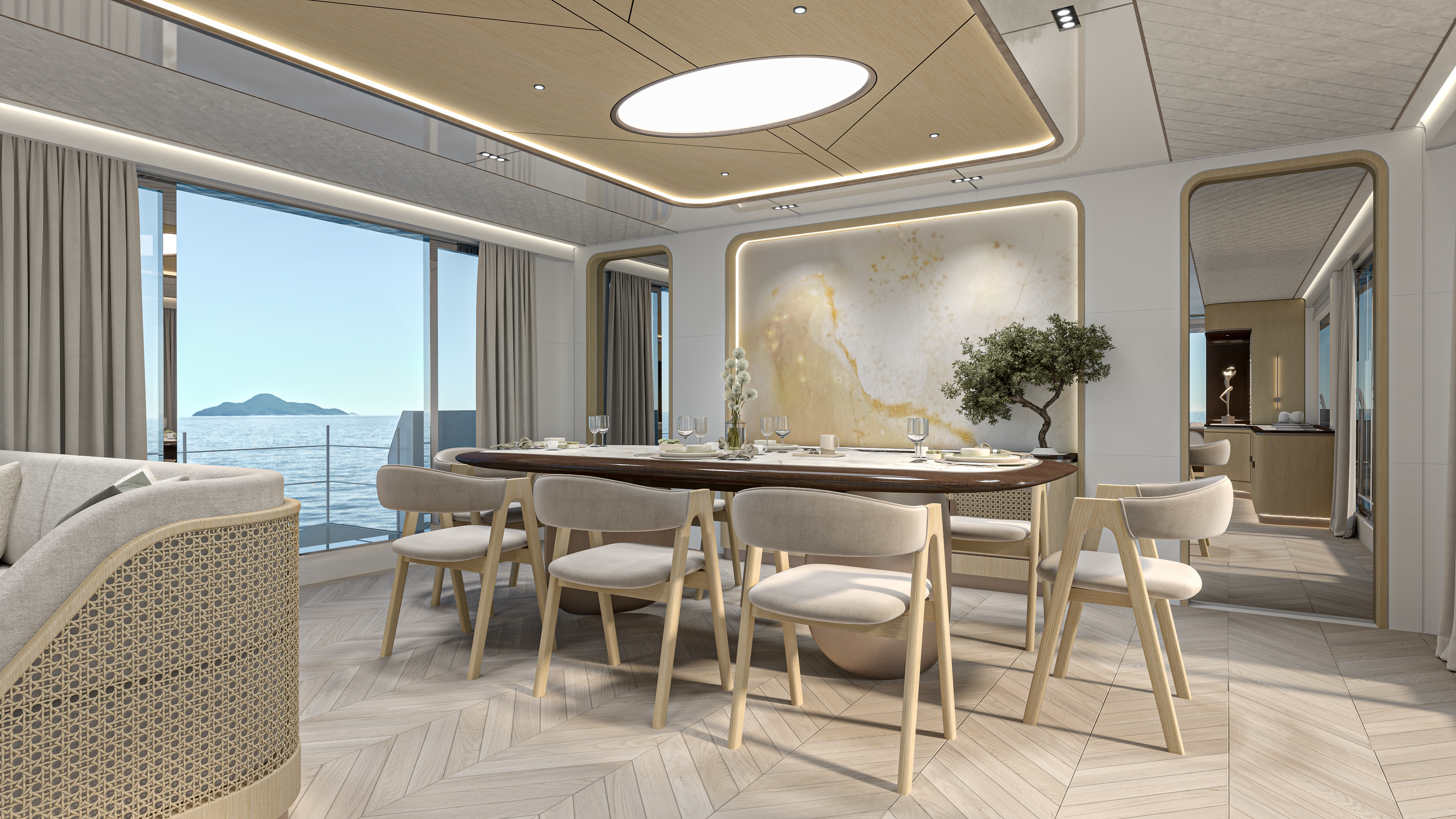 İtaliyada yerləşən yaxta layihəsinin vizualizasiyası. Premium materiallar və incə detallarla dəniz həyatının zərifliyini ön plana çıxaran yüksək səviyyəli konsept.